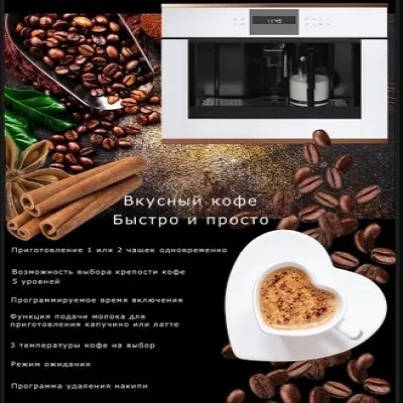 Кофемашина Kuppersbusch CKV 6550.0 ЖК-дисплей с текстовым и графическим полями Электронная система управления с сенсорными кнопками Программируемое количество кофе для 5 размеров чашек (эспрессо, малая, средняя, большая, высокая) Приготовление 1 или 2 чашек Функция подачи молока для приготовления капучино или латте Съемный контейнер для молока с функцией очистки Возможность использования кофейных зерен или молотого кофе Регулируемый по высоте раздатчик кофе Давление при заваривании ? 15 бар 3 температуры кофе на выбор Возможность выбора крепости кофе (5 предварительно заданных уровней) Отдельные нагреватели для заваривания кофе и приготовления горячей воды Программа удаления накипи Автоматическое ополаскивание при включении и отключении Емкость для воды заполняется спереди Электронный таймер с белыми индикаторами Программируемое время включения Режим ожидания Телескопические направляющие для легкого заполнения кофемашиныПодсветка чашекНаблюдение доставляет удовольствие - хорошо известный факт. Светодиодная подсветка преподносит только что сваренный кофе в правильном свете. И приготовление кофе становится хорошей традициейЕмкость для свежей водыДуховые шкафы и кофемашины Kuppersbusch легко встраиваются в любую кухонную мебель, так как благодаря наличию емкости для свежей воды подсоединение к водопроводу не требуютсяХарактеристики:Потребляемая мощность: 1,35 кВт (вилка Schuko)Размеры прибора (Ш x В x Г): 595 x 455 x 475 мм (вкл. фасад 20 мм и телескопические направляющие) Размеры ниши (Ш x В x Г): 560 x 450 x 550 мм